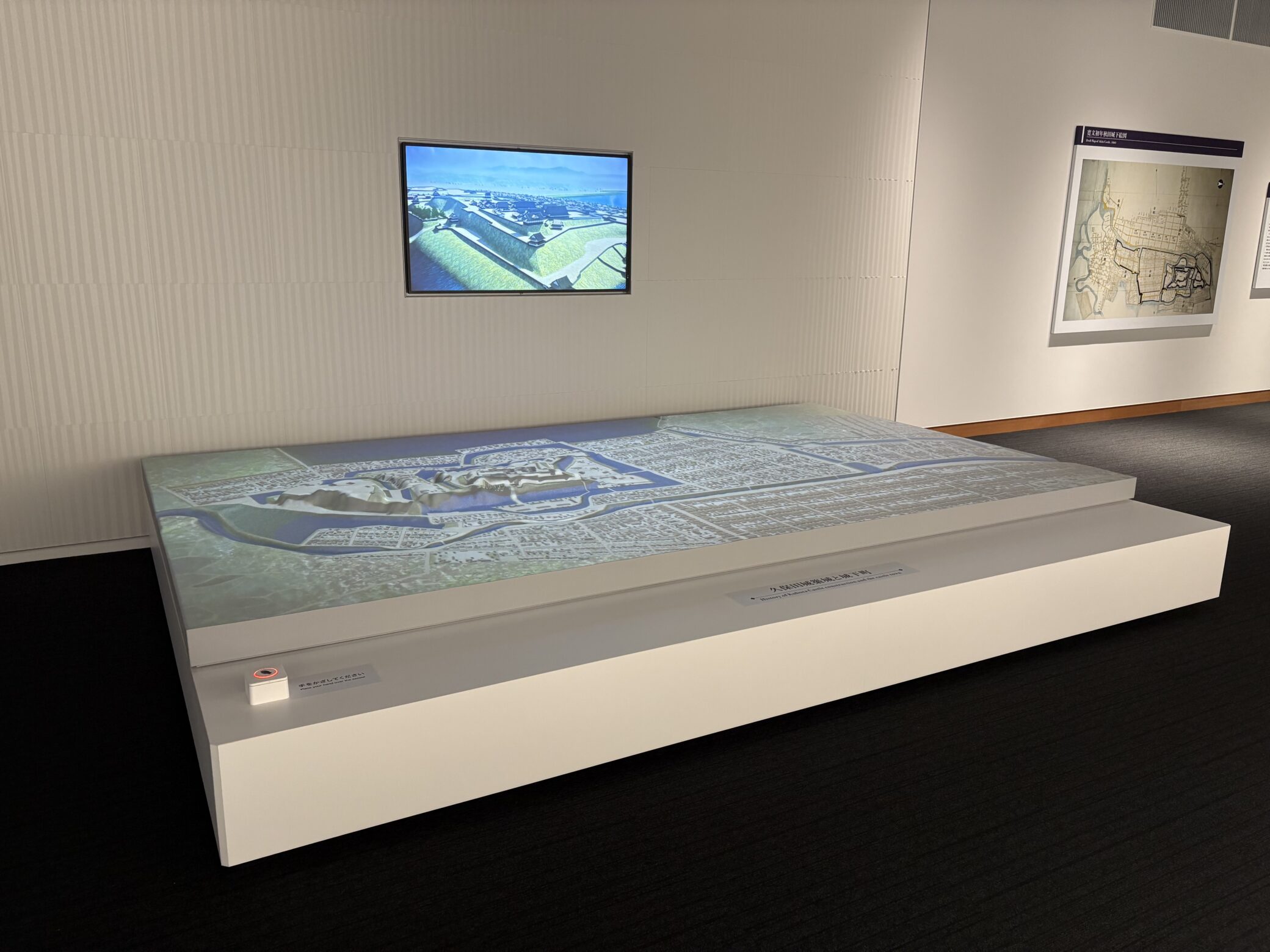 新しくなった史料館では、3千点を超える所蔵品の中から厳選された展示品を通して、秋田の歴史の積み重なりと触れることができます。展示室に入ってすぐさま目に飛び込んでくるのは、佐竹氏が長い年月をかけてつくり出した久保田城城下町のプロジェクションマッピング。発見されている地図史料が重なっていくことで、現在の秋田の町に至るまでを視覚的に分かりやすく知ることができます。