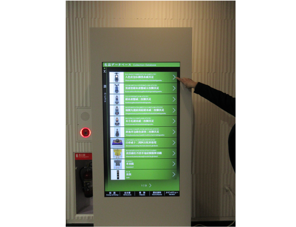 ②「名品データベース」などが見られるタッチパネルがあり、ちょうど家族で来館していたお子様がタッチして見ていた。これは子供にも見やすくていいなと思った。
