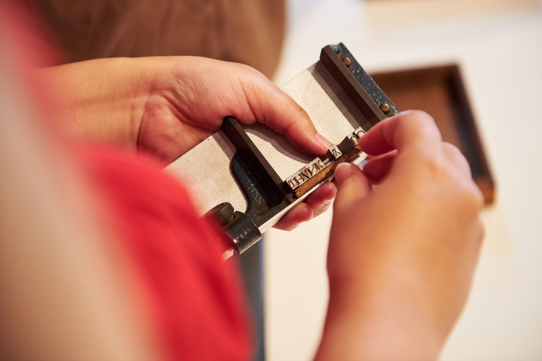 ステッキという専用の道具に、拾った活字を並べていきます。活字が倒れないよう、ステッキを持つ手の親指で、軽く押さえながら並べるのがコツです。