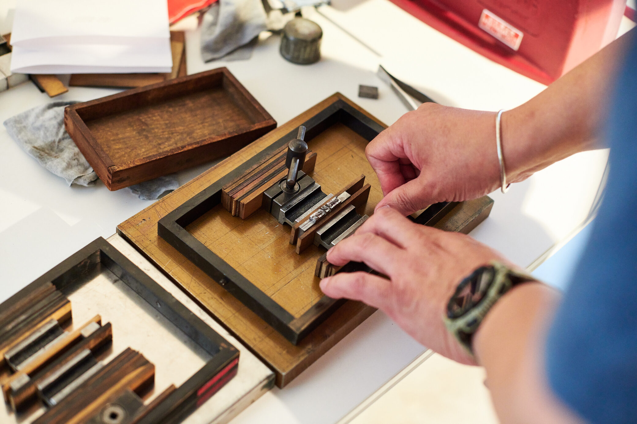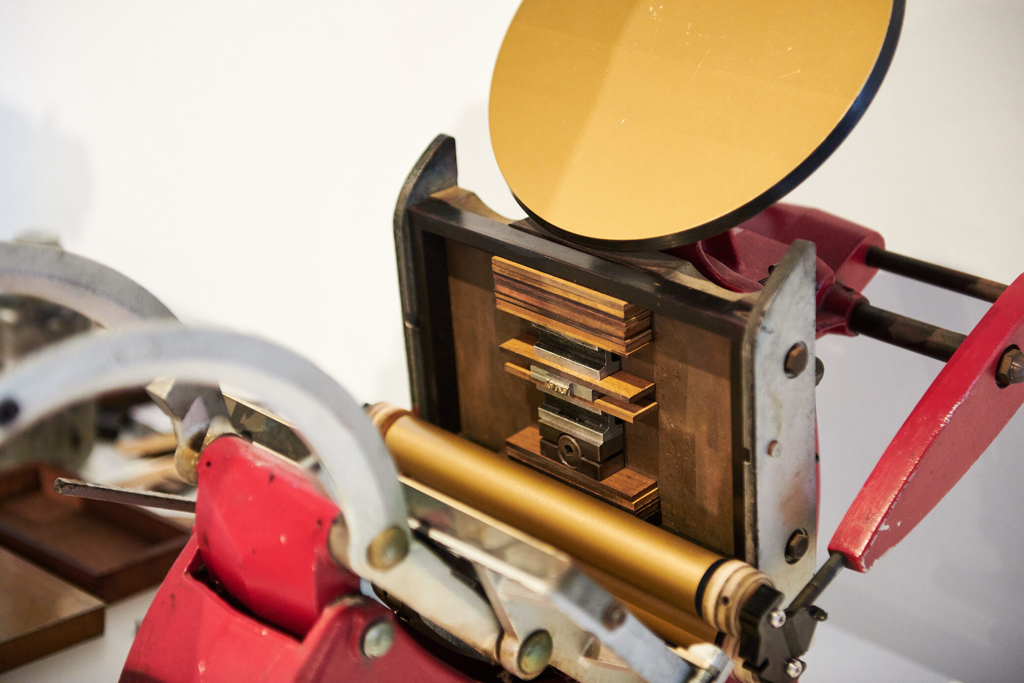 拾った活字を、四角い鉄製の枠(チェース)に固定します。活字と枠の間には、木材で出来たインテルを駆使して、印刷物の真ん中に押せるように調整していきます。