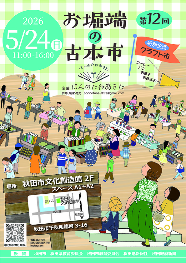 毎年春と秋に開催しているお堀端の古本市も12回目、5周年となります。今回は秋田市文化創造館の2階スタジオAにて、古本市の他に特別企画クラフト市も同時開催。県内外から40店舗以上の古本屋と10店舗ほどの手作りクラフト作家の作品販売、コーヒーやパン、お菓子などの出店もあります。秋田県内最大の古本市にぜひお越し下さい。