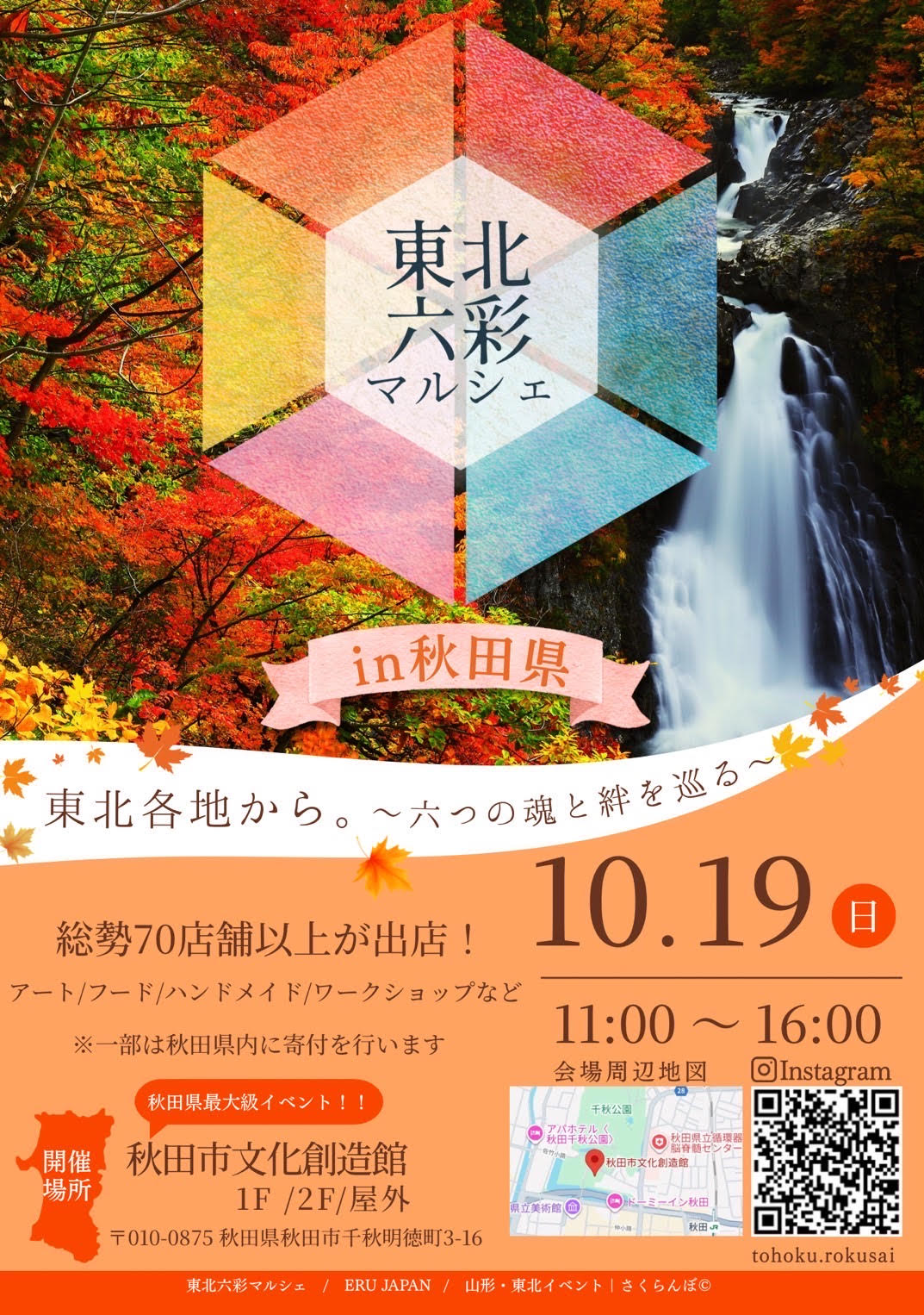 東北県民の声から開催が決定したチャリティーイベントです。2025年に東北六県でマルシェを開催します。会場では、東北各地から75店舗以上が集まり、フード・ハンドメイド作品・ワークショップ・占いなど、様々なバラエティー豊かなお店が並びます。また、収益の一部が秋田県内の子ども食堂や小中学校へ寄付が行われます。出店者情報などはInstagramからご確認ください。今年初開催、どうぞ東北を共に盛り上げていけたら嬉しいです!