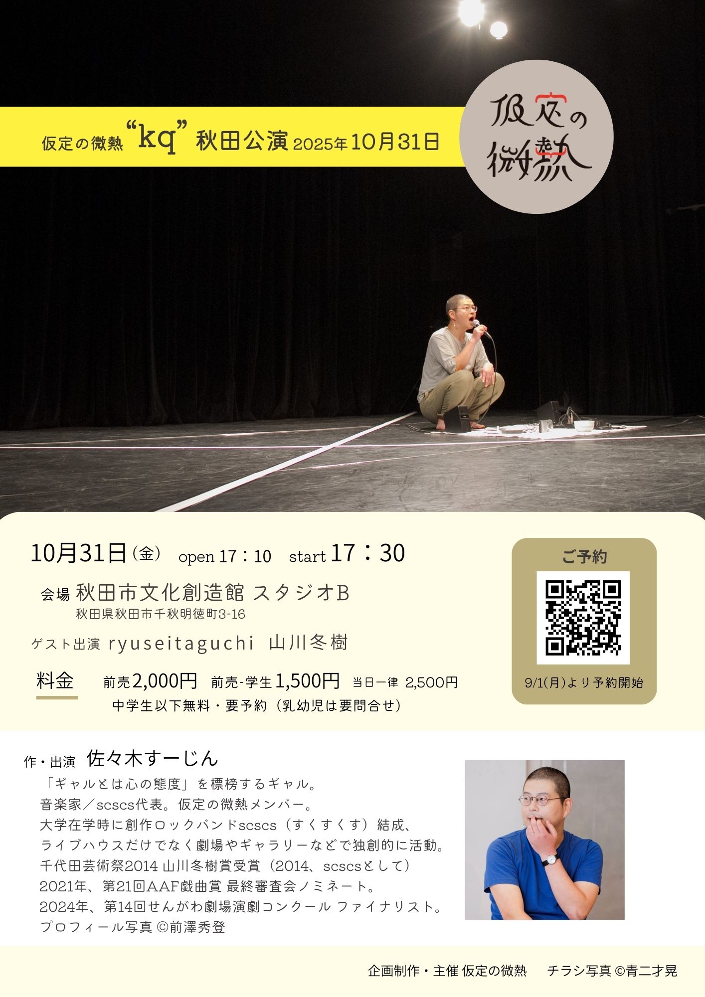 “kq”とは? けーきゅー。2019年から佐々木すーじんが取り組む「呼吸による音楽」プロジェクト。 呼吸音の指示テキストとイラスト、抽象的な物語で構成された譜面。2021年、第21回AAF戯曲賞 最終審査会ノミネート。 2022年、冊子とCDでプロダクト展開。 2024年、第14回せんがわ劇場演劇コンクール本選にて上演。2025年、EPAD2025年度セレクション作品③アーカイブに採択。