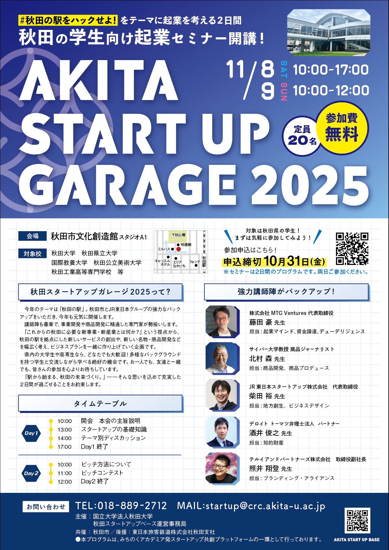 秋田市とJR東日本グループの強力なバックアップをいただき、「秋田の駅をハックせよ!」をテーマに秋田の学生向けセミナー「AKITA START UP GARAGE 2025」を開催します。