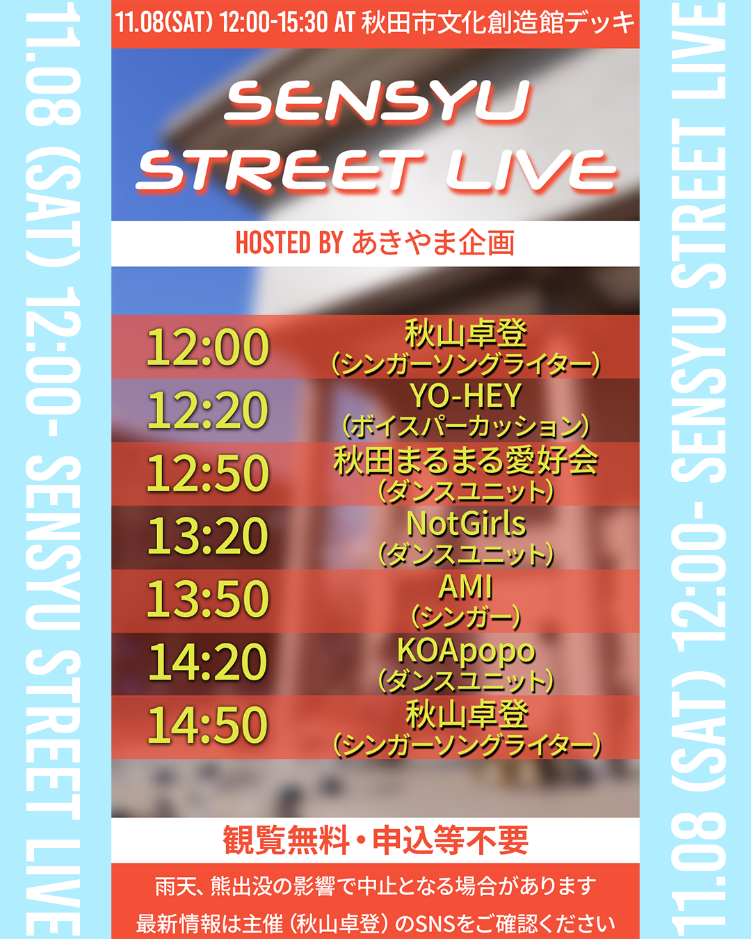 様々なパフォーマンスが楽しめる「SENSYU STREET LIVE」、今回で4回目の開催となります!ちょっと肌寒いかもしれませんが、音楽で心はホットに!いや、身体ごとホットになって気持ちよく秋の空気を満喫しましょう!