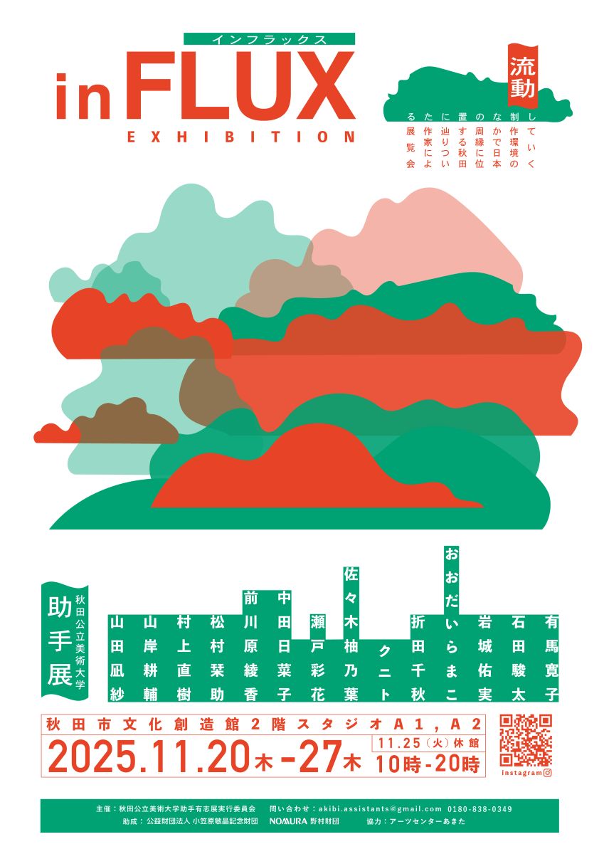 教育・研究・創作に携わる助手たちによるグループ展『in FULX』を、秋田市文化創造館にて開催します。 “流動”を意味する「flux」と、そこに滞在する「in」を掛け合わせた本展では、移ろいゆく思考や実践のプロセスそのものを多様なメディアで表現します。