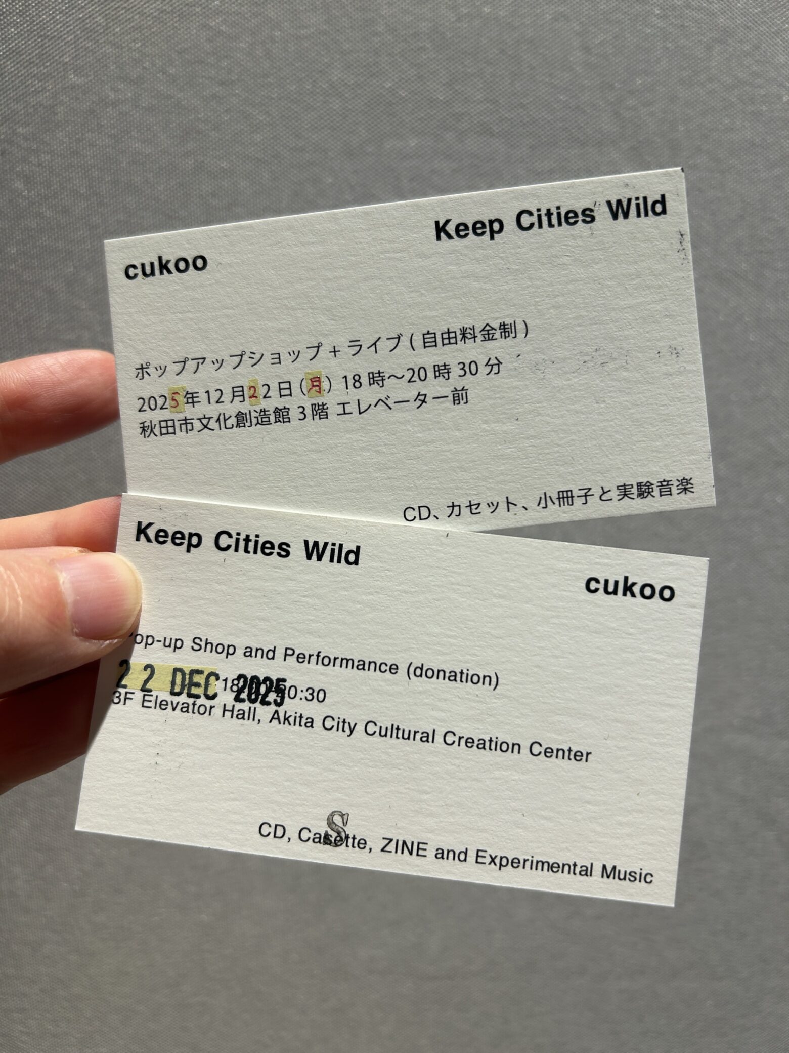 国内外のエクスペリメンタルな音楽をリリースし続ける秋田発のレーベル”cukoo“さんと、吉濱の個人レーベル”Keep Cities Wild“とで、昨年に引き続きポップアップショップイベントを開催します。