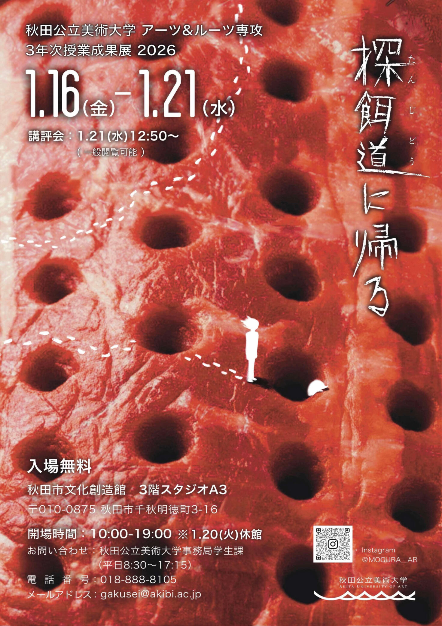 このたび秋田市文化創造館3階スタジオA3にて、アーツ&ルーツ専攻の3年次授業成果展「探餌道に帰る』を開催いたします。 探餌道(たんじどう)とは、もぐらが餌を探すために掘る、一度きりのトンネルのことをいいます。わたしたちが普段行っている「内に深く入り込み、探求する」活動を、もぐらの「探餌道」に見立て、展示タイトルとしました。