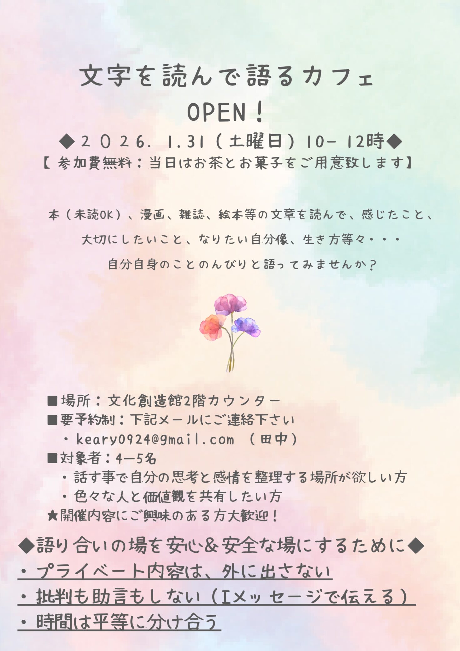 本(未読OK)、漫画、雑誌、絵本等の文章を読んで、感じたこと、大切にしたいこと、なりたい自分像、生き方等々..穏やかな雰囲気で美味しいお茶とお菓子を食べながら、のんびり自分自身のこと語ってみませんか?
