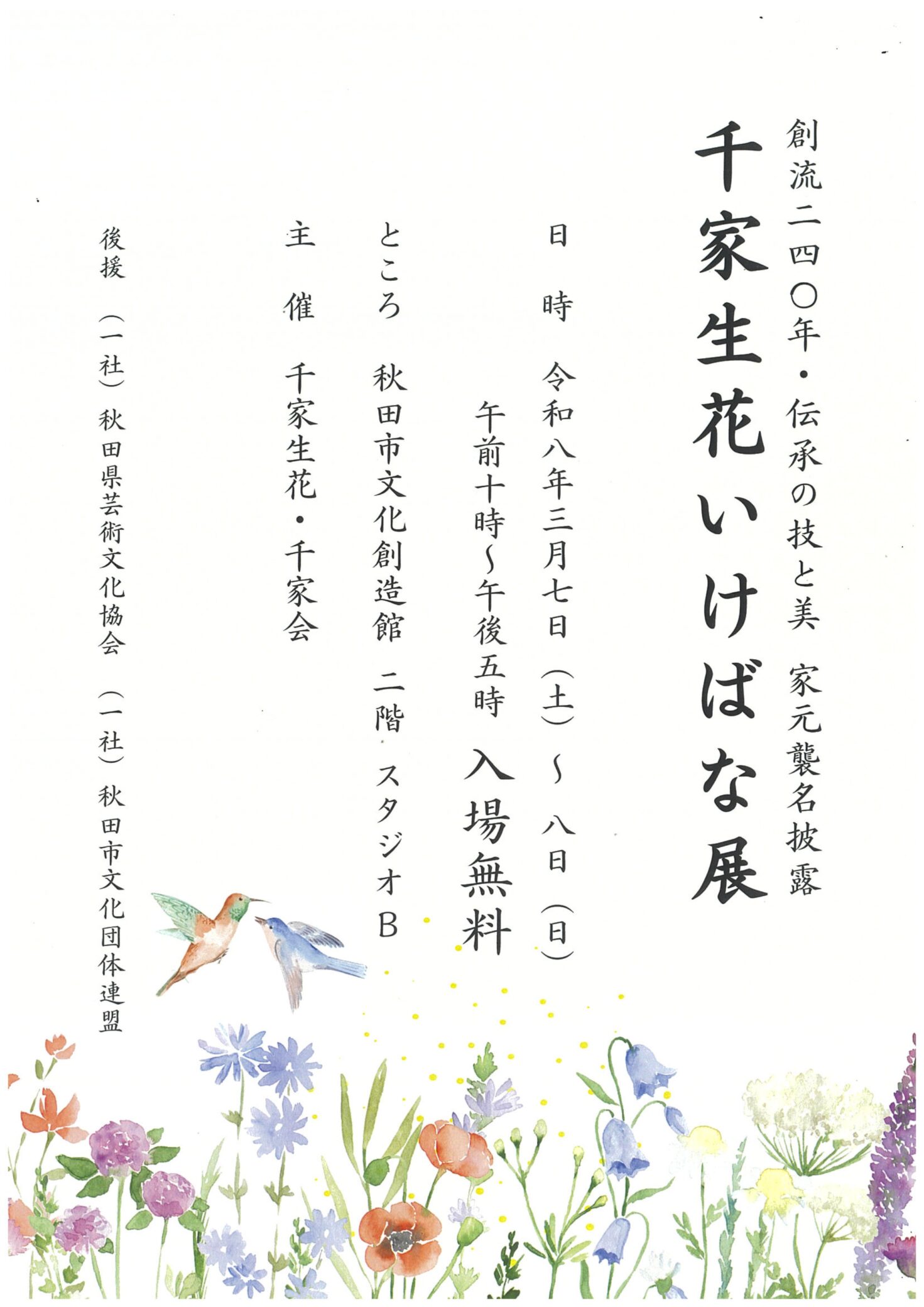 主催千家生花・千家会後援(一社)秋田県芸術文化協会(一社)秋田市文化団体連盟お問い合せTEL| 090-9395-1689