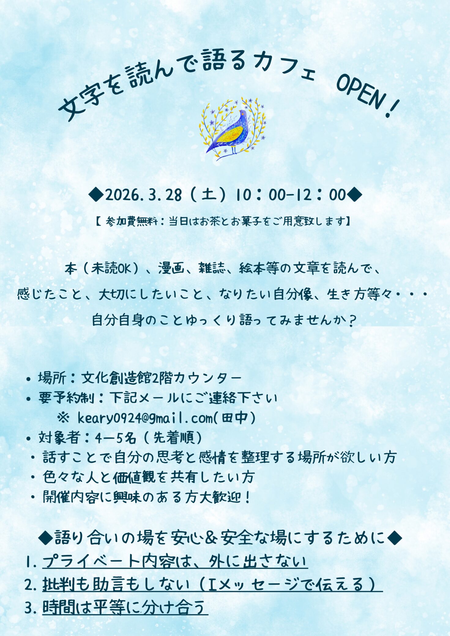 本(未読OK)、漫画、雑誌、絵本等の文章を読んで、感じたこと、大切にしたいこと、なりたい自分像、生き方等々、美味しいお菓子とお茶を飲みながら、ゆっくり自分自身のこと語ってみませんか?