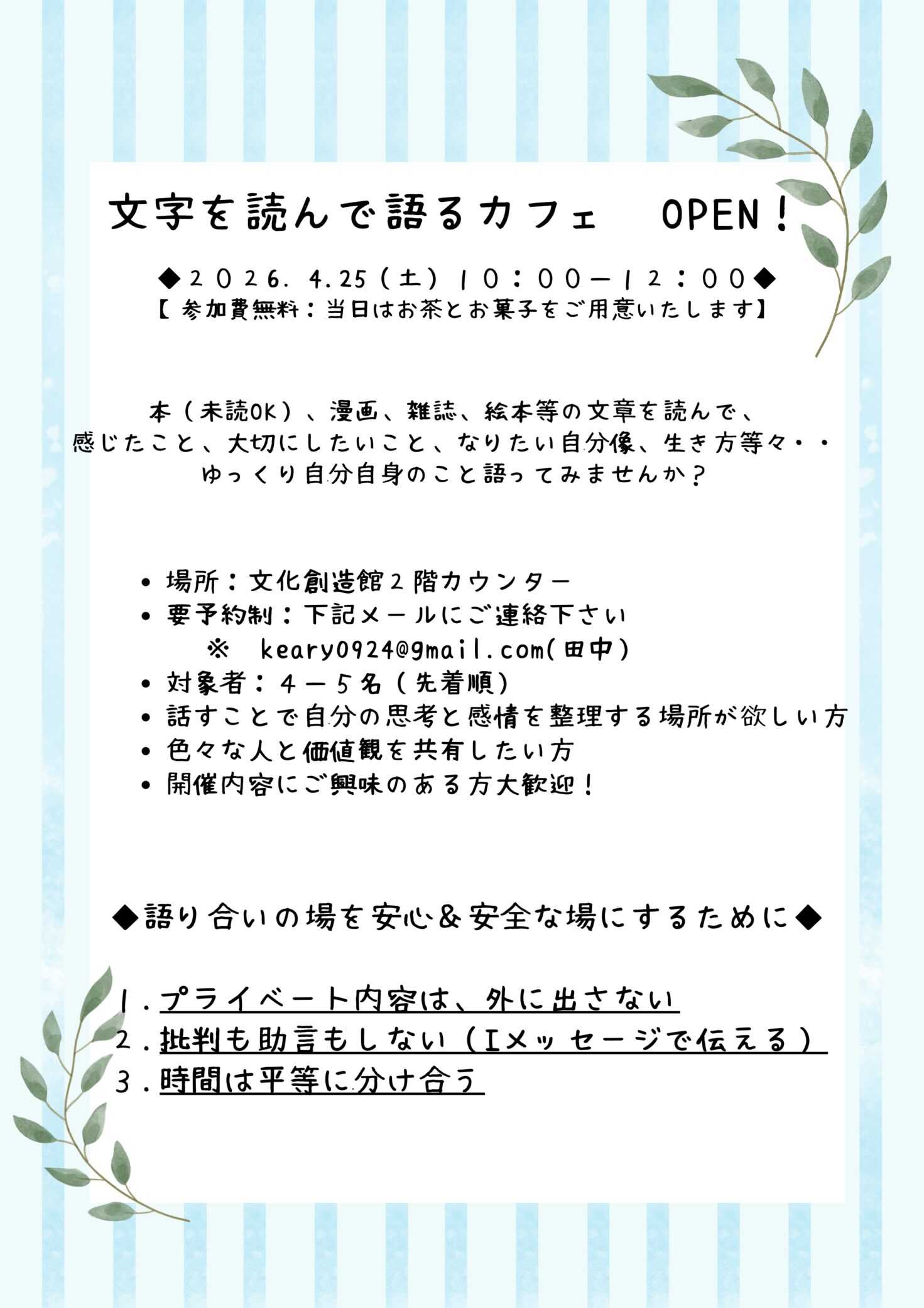 本(未読OK)、漫画、雑誌、絵本等の文章を読んで、感じたこと、大切にしたいこと、なりたい自分像、生き方等々..美味しいお菓子とお茶を飲みながら、自分自身のことゆっくり語ってみませんか?