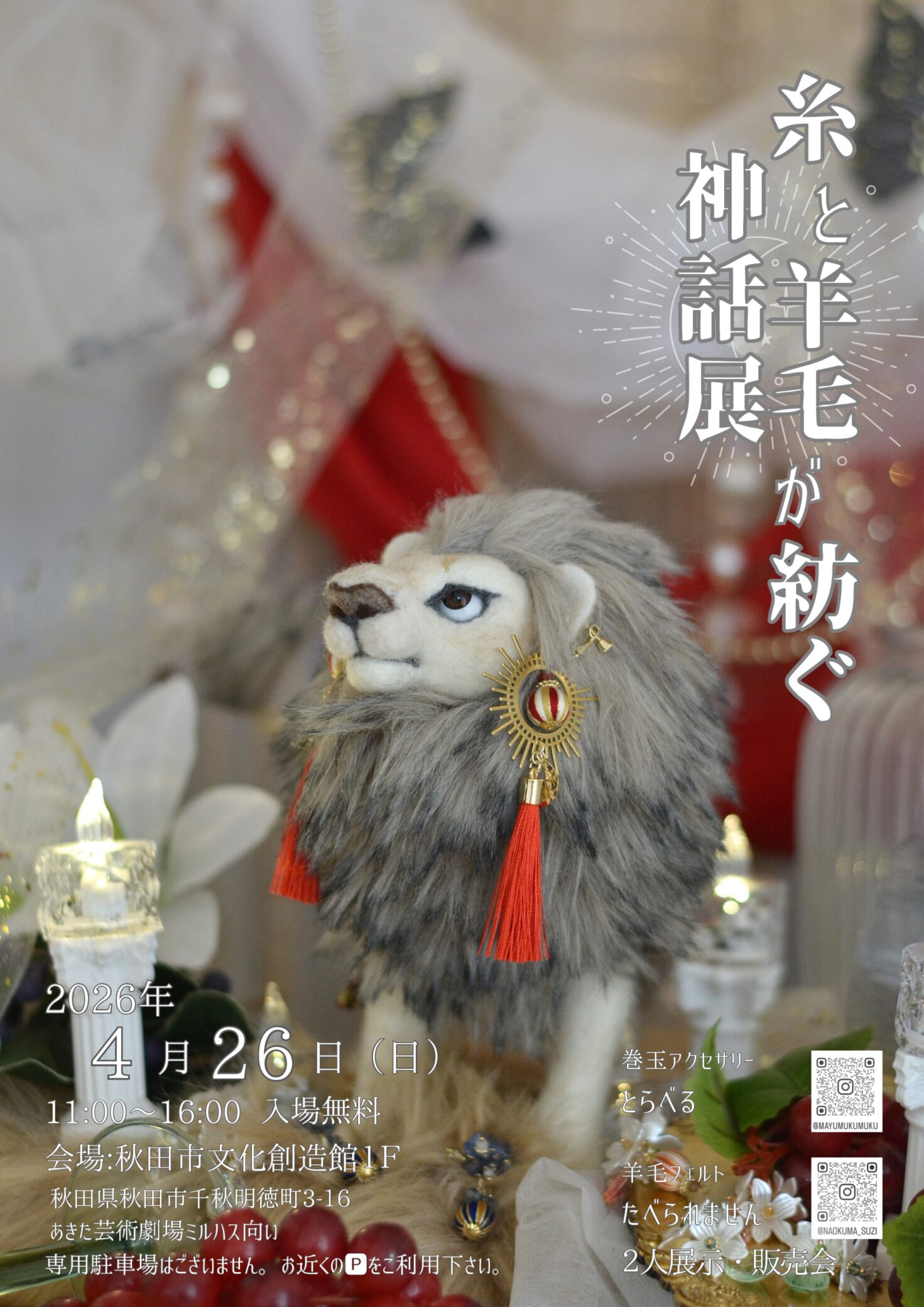 異世界を秋田に。✿巻玉アクセサリー作家 とらべる ✿羊毛フェルト作家 スジオによる2人企画展。今回のテーマは「神話」世界の神話に出てくる神々をイメージした巻玉アクセサリーの販売。