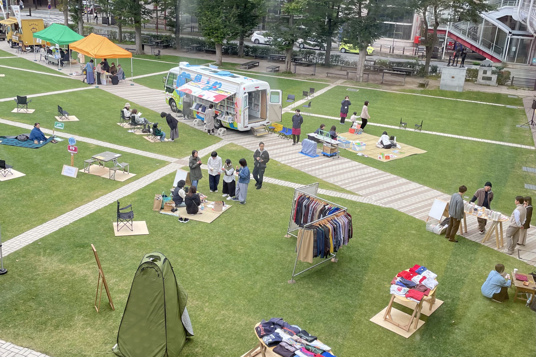 :「駅前の公共空間の使い方」に対して集まった意見やアイデアをもとに、秋田駅前芝生広場の使い方や過ごし方を一緒に試す実践を行いました。