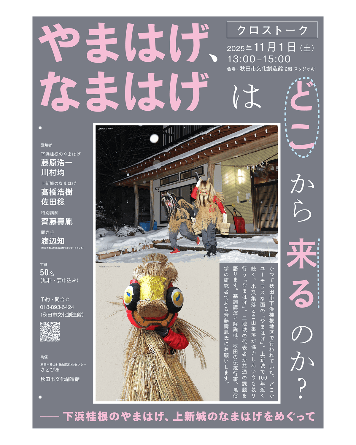 この度、「下浜桂根のやまはげ」「上新城小又・白山のなまはげ」二つの行事を継承してきた関係者が、共通の課題を語りあうクロストークを企画しました。