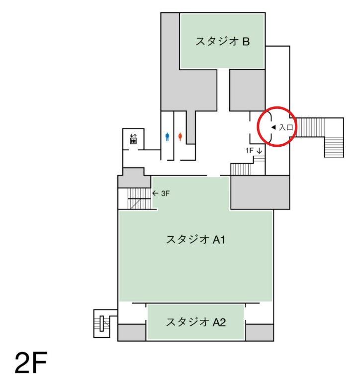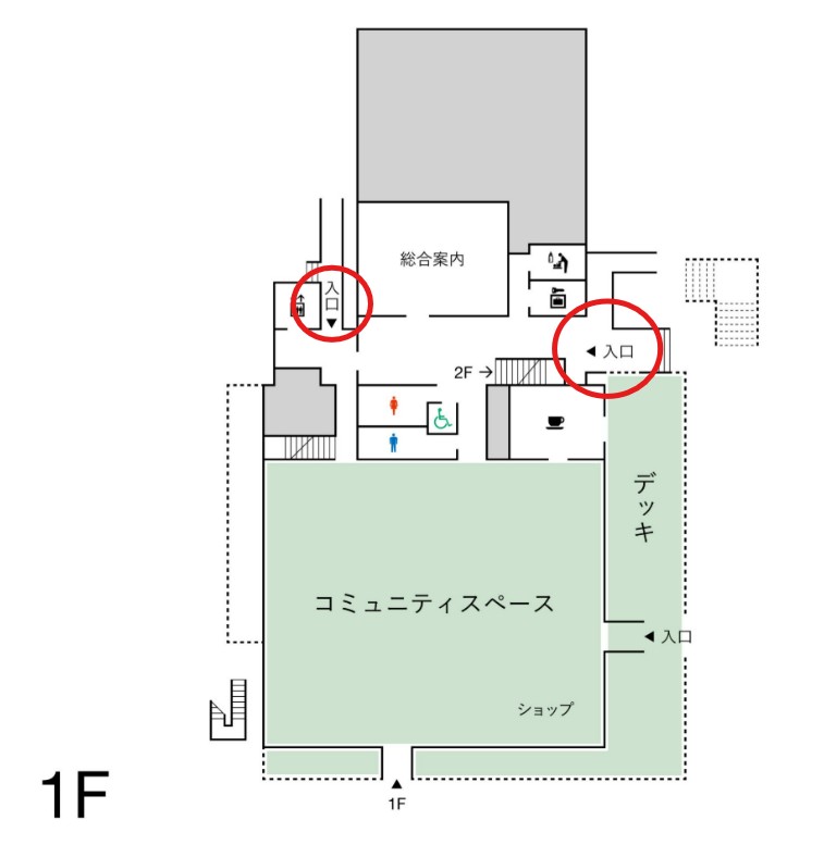※手動開閉となる自動ドアは1Fの南側及び北側の2箇所、2F南側の1箇所です(下図の赤丸部分)。